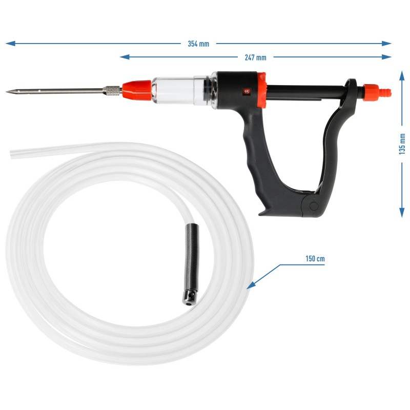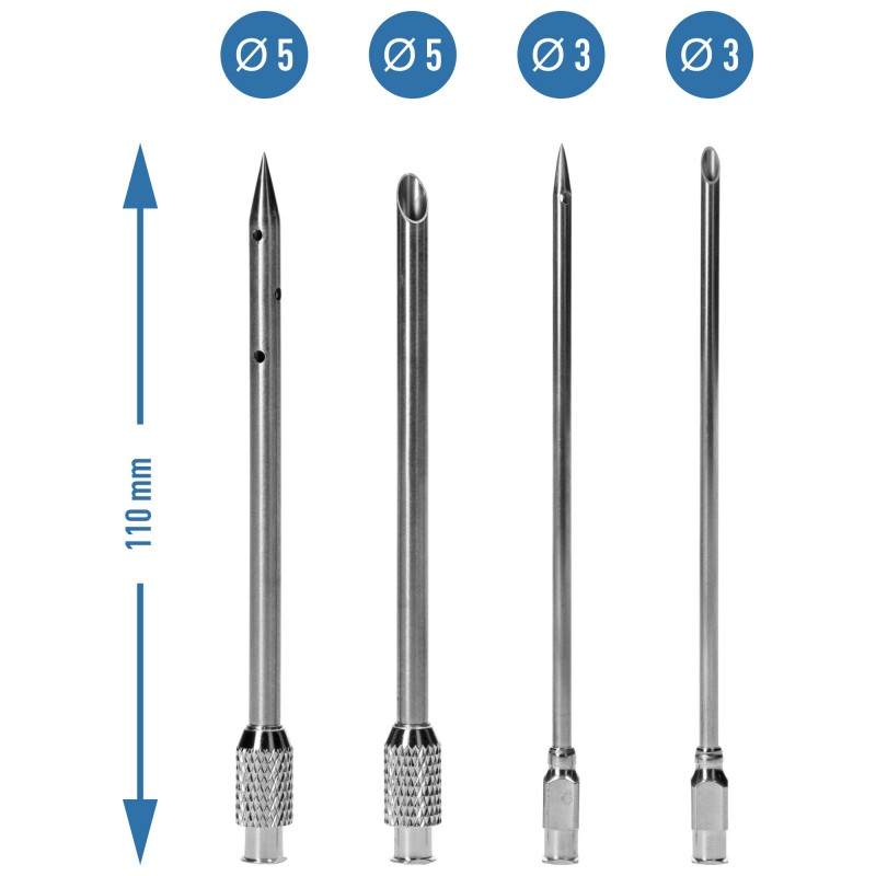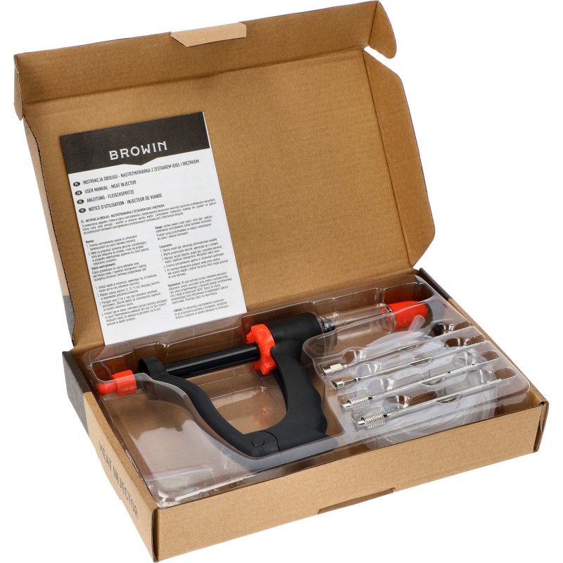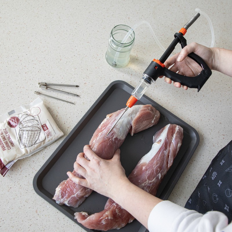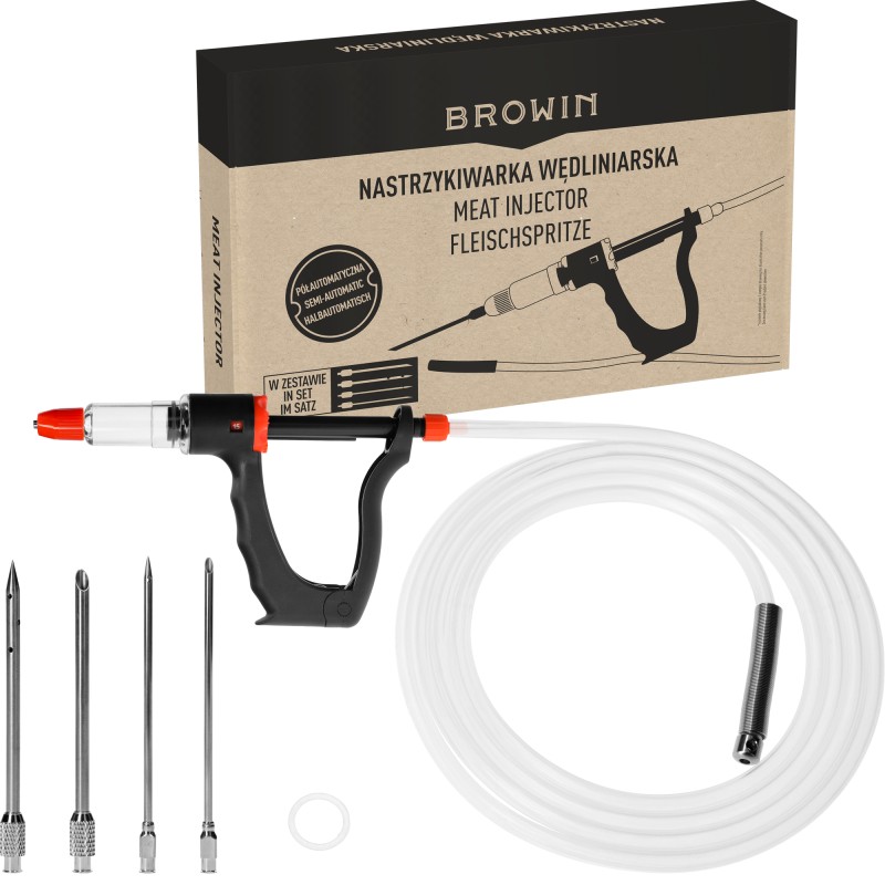 Długi wężyk z tworzywa o długości 1,5 m, z obciążnikiem, pozwoli Ci na czerpanie z naczynia solanki w takiej ilości, jakiej potrzebujesz - zależnie od wielkości peklowanej porcji, struktury mięsa i wskazań w przepisie. Docenisz stabilność igieł, wielofunkcyjną, ergonomiczną rączkę do zasysania zalewy peklującej i nastrzykiwania mięsa, a także automatycznie napełniający się zbiornik i regulowaną objętością nastrzyku (5, 10, 15 ml). W komplecie otrzymujesz 4 igły o różnych średnicach: 2 szt. z Ø3 mm i 2 szt. z Ø5 mm, a także zapasowy ring (pierścień mocujący do igieł).