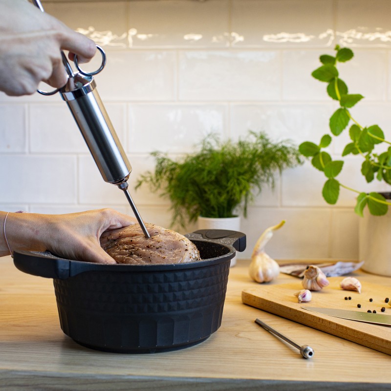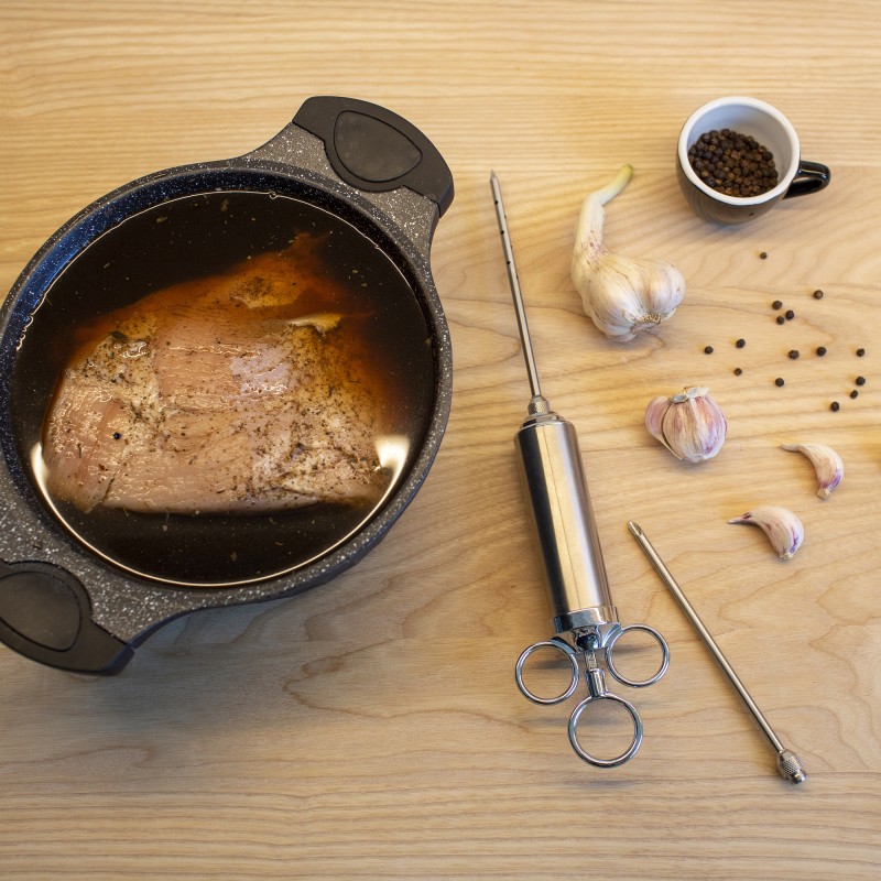 Przedstawiamy poręczną, innowacyjną i prostą w użyciu nastrzykiwarkę, która pozwala na profesjonalne nastrzykiwanie mięs i wędlin zalewami oraz marynatami, w domowym zaciszu! Zadbaj o pyszny smak, kruchość i dłuższą trwałość swoich wyrobów mięsnych. Dzięki swojej konstrukcji oraz dwóm rodzajom igieł - przygotowywanie mięs do peklowania będzie jeszcze prostsze i szybsze!