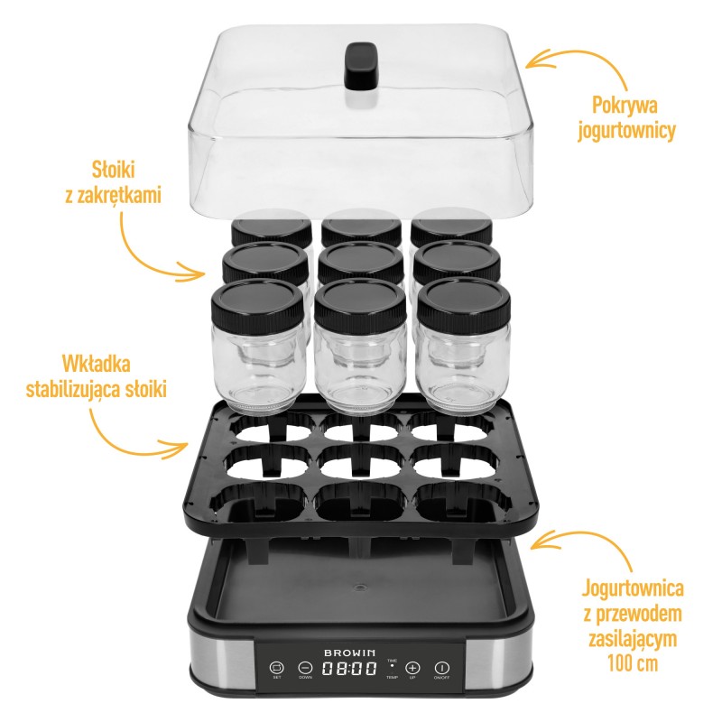 Odkryj wygodę i przyjemność tworzenia własnych jogurtów. Nasza jogurtownica pozwala na jednorazowe przygotowanie aż 9 porcji pysznego, domowego jogurtu (a także kefiru). W zestawie znajdziesz szklane słoiczki typu twist-off (180 ml) - wyjątkowo szczelne i poręczne, co czyni je pojemniczkami wprost idealnymi do zabrania do pracy, szkoły czy na wycieczkę. Są wielorazowe, a więc bardzo ekologiczne - umyjesz je i napełnisz z łatwością.