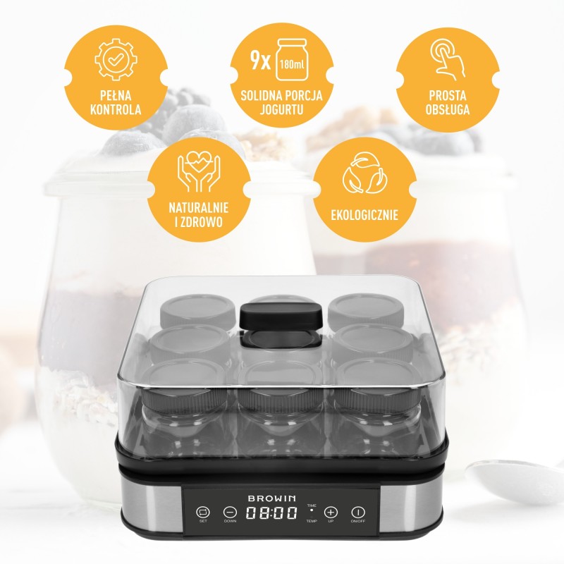 Z łatwością i szybko przygotujesz naturalny jogurt bez sztucznych dodatków, konserwantów czy cukrów. Możesz wzbogacać swoje jogurty świeżymi owocami, orzechami lub miodem. To Ty decydujesz, co znajdzie się w Twoim jogurcie - choć z pewnością warto uwzględnić też żądania innych domowników